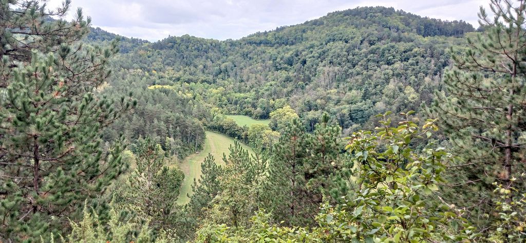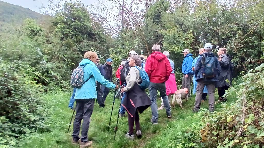 Petit moment de recul car une chasse est en cours , nous restons sur le parcours fléché et nos bavardages vont signaler notre présence . Le paysage a bien changé si l’on se réfère aux panneaux explicatifs échelonnés sur le sentier Le vignoble des » Cavets » a disparu , un pâturage est encore exploité malgré l’emprise des broussailles , merci à nos portiers bénévoles pour l’ouverture et fermeture des barbelés . Alors que nous descendons sur Cuisiat une averse obscurcit les 3 monts ( Mt Myon , Châtel , Montfort ) mais une légère brise la détourne sur un autre vallon ; vite rangeons nos capes pour mieux conjurer le sort . Nous reprenons notre itinéraire par une longue montée progressive sur une sente qui sera bientôt recouverte de ronces si l’entretien de la trace n’est pas fait . Nous dominons le vallon verdoyant de Vaux et les rochers de la Cabatane . Nous recouvrons un peu plus de clarté au belvédère des bans des chasseurs .