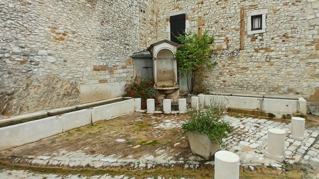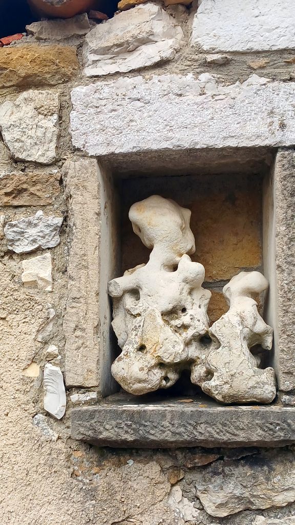 Profil descendant pour rejoindre le château par le sentier des orchidées qui en automne sont remplacées par des cyclamens et quelques asters . Un rayon de soleil illumine les murailles de la forteresse . Le nouveau chatelain a défriché les terres pour implanter une vigne dénommée Angèle du nom de la propriétaire du terrain et installer des ruches . Nous arrivons derrière le château , nous jetons un coup d’oeil à travers les lames du portail ( trébuchet , statues , donjon ) et nous empruntons le chemin de ronde et les rues aux multiples fontaines .