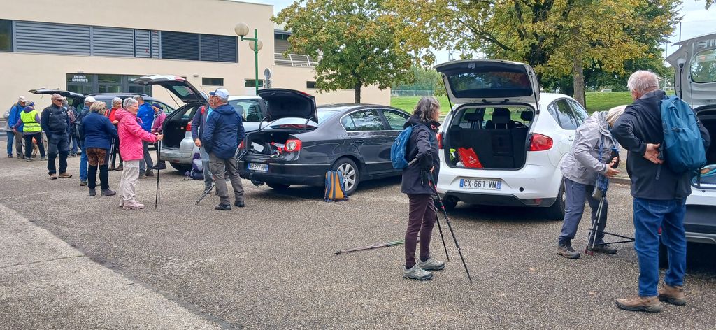 Changement de programme ; en raison d’une météo maussade et très fraîche la rando aura lieu l’après midi à Val Revermont plus exactement à Treffort . Une cité médiévale à flanc de colline que l’on croit connaitre mais qui réserve toujours de nouvelles surprises . 21 randonneurs ( un record ) investissent le parking du complexe sportif et sont préparés mentalement à subir quelques averses . Nous empruntons la voie douce ensablée en contrebas du village sur environ 1 km et nous abordons la grimpette dans des ruelles et dans des passages plus secrets au milieu des jardins et des fortifications .