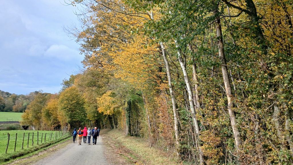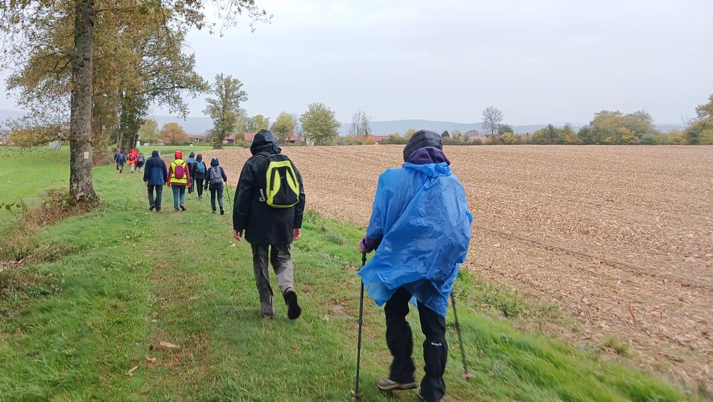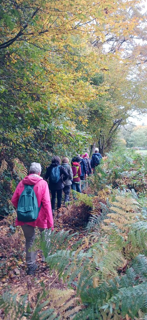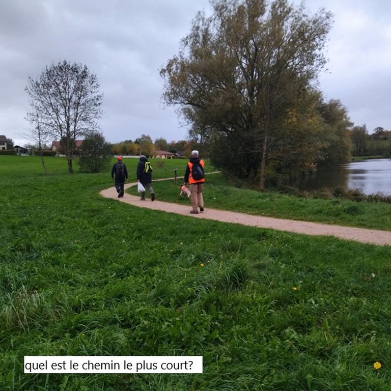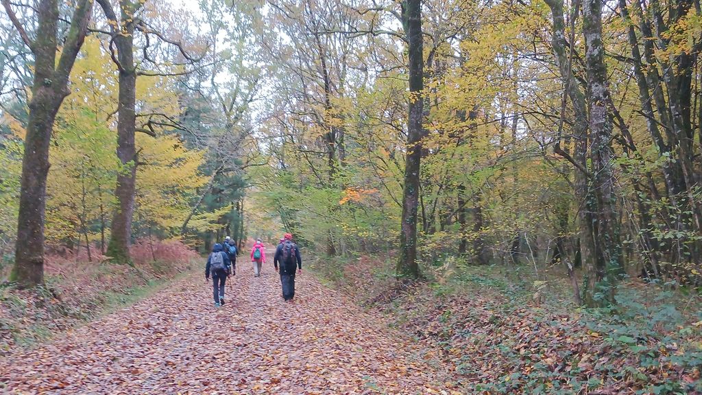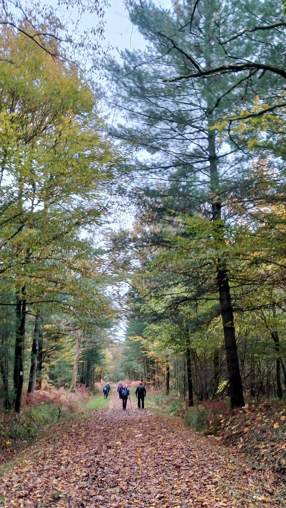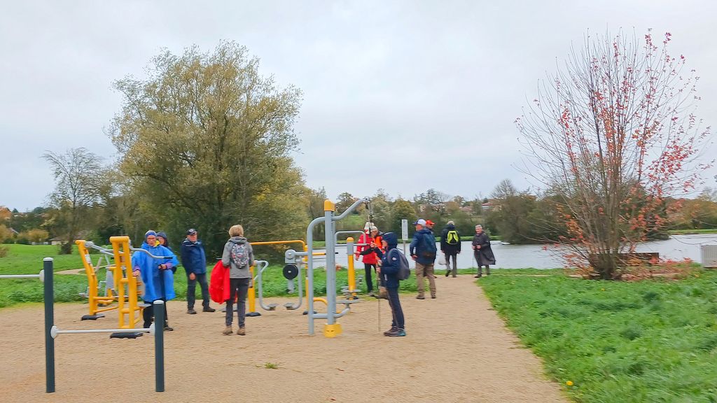 Le temps se gâte , une petite pluie fine survient alors que nous nous engageons sur la trace rectiligne de plus d’un km dans la forêt du Châtelet mais nous sommes un peu plus à l’abri . Nous nous imprégnons de cette ambiance automnale humide , il faut quand même sortir les capes pour un court instant et redescendons sur le plan d’eau en observant des daims dans une propriété . Nous testons les agrès de l’aire de fitness et nous nous scindons en 2 groupes pour faire le tour de l’étang . Qui arrivera en premier ? on ne saura pas mais les 14 marcheurs sont bien présents pour déguster le gâteau aux noix d’Anne et rentrons dans nos pénattes sous une pluie battante tout en observant une voiture doubler toute une file par la droite sur la rocade….