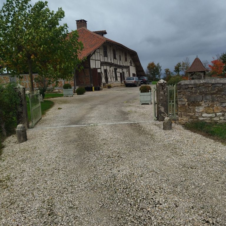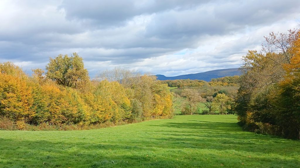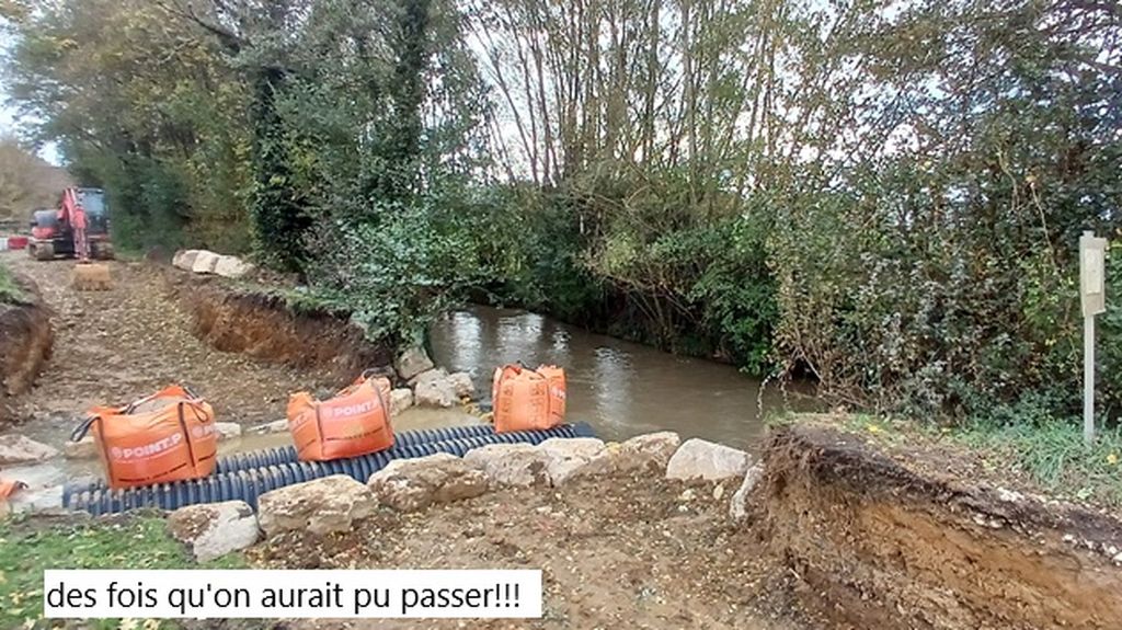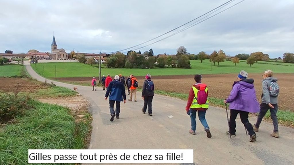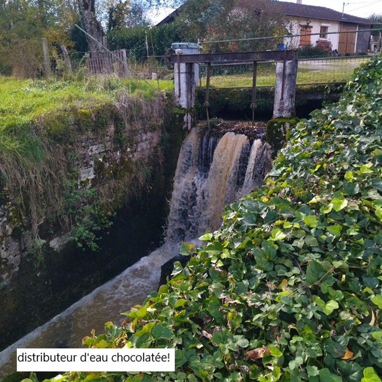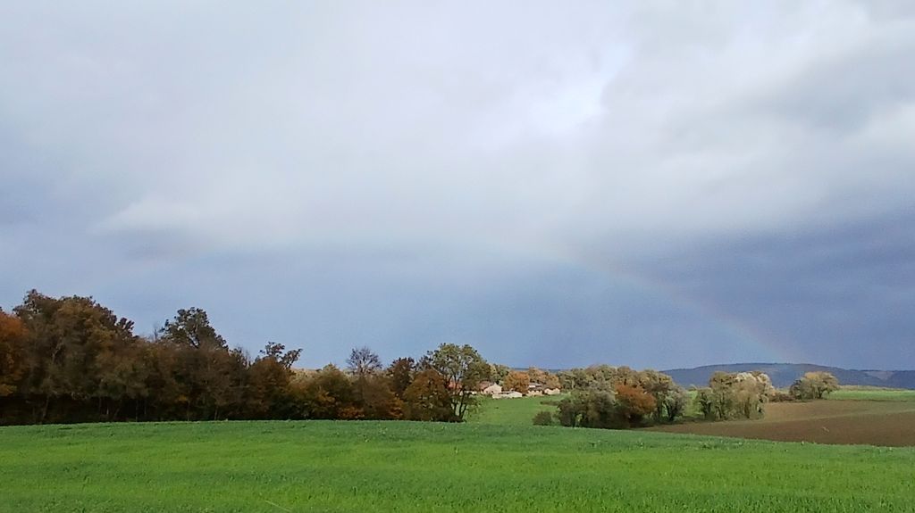 Le petit bief du Tharlet crache une eau chocolatée et mousseuse(cappucino…) Nous quittons les zones urbanisées pour emprunter un chemin forestier tapissé de feuilles mortes mais à l’abri du vent . Une petite route nous conduit jusqu’au pont du Sevron à proximité du moulin de Chaffoux . Nous traversons la voie ferrée juste avant le passage de la micheline et nous montons sur la colline où la ferme éponyme ( élevage de vaches laitières ) domine des plateaux vallonnés de la Bresse . Par moment un rayon de soleil illumine les feuillages aux couleurs dorées et sublime les prairies verdoyantes , un petit crachin fait apparaître un soupçon d’arc en ciel .