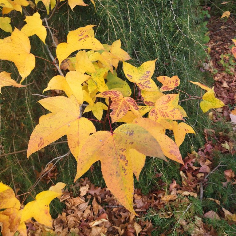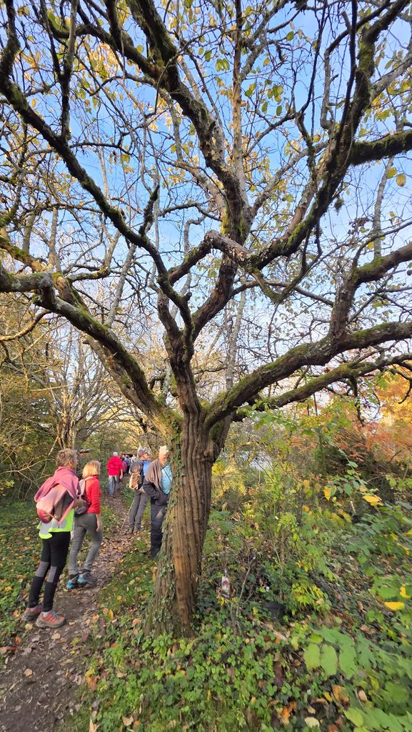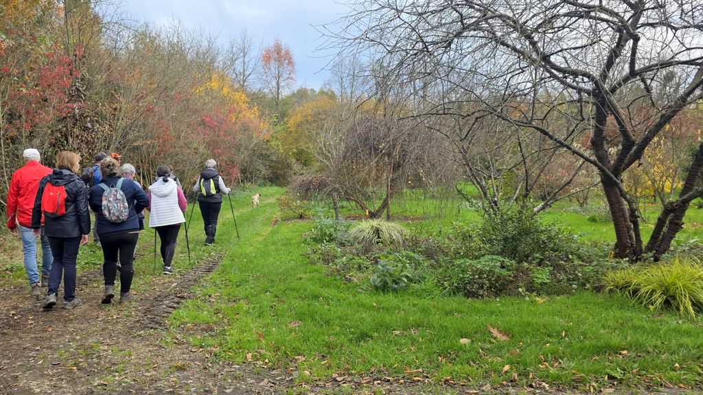 Certains randonneurs plus habitués des parcs de Chatillon ou d’Etrez semblent décontenancés par le bric à brac de la cour , c’est un désordre organisé . Des arbustes étiquetés en pots sont alignés le long de la vieille ferme en pisé . nous avons l’autorisation de déambuler librement dans cet environnement sauvage , touffu , anarchique , bucolique mais combien captivant . Rien à voir avec les parcs à la française aux allées ensablées , régulières , symétriques ; ici la nature n’est pas domestiquée . Début novembre l’automne a déjà » déplumé » les arbres mais il reste encore des feuillages rouges , jaunes , verts ; mais ils appartiennent à quels végétaux ? Quercus (chênes) , fagus (hêtres ) ,pinus ( pins ) , aces (érables ) ,ilex ( houx ) ; ce n’est pas » facilus » de décripter les étiquettes sans traduction !