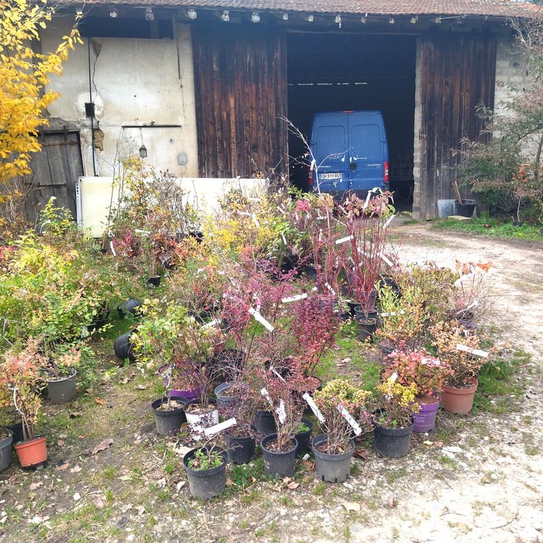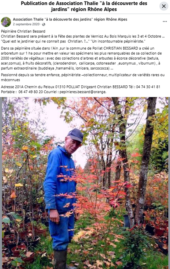 Christian Bessard le propriétaire des lieux est un pépiniériste passionné depuis sa plus tendre enfance , il est connu dans la région Rhônes Alpes , il expose ses variétés d’arbustes rares et méconnues dans des marchés ( Chatillon sur chalaronne , les Avenières etc… et partage son savoir faire . Il prendra bientôt sa retraite . Sa soeur et son beau frère nous accueillent car il est occupé avec un client et prend son repas . Il a créé l’arboretum du Peloux sur plus d’un hectare .