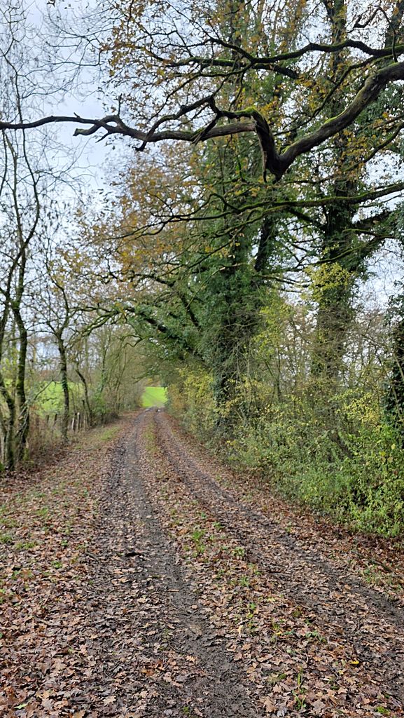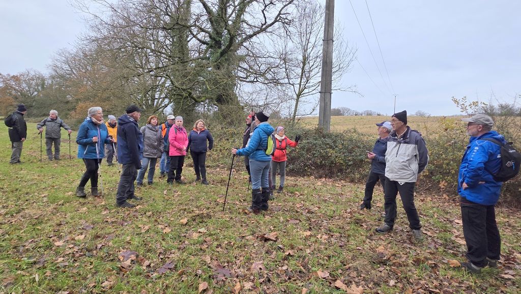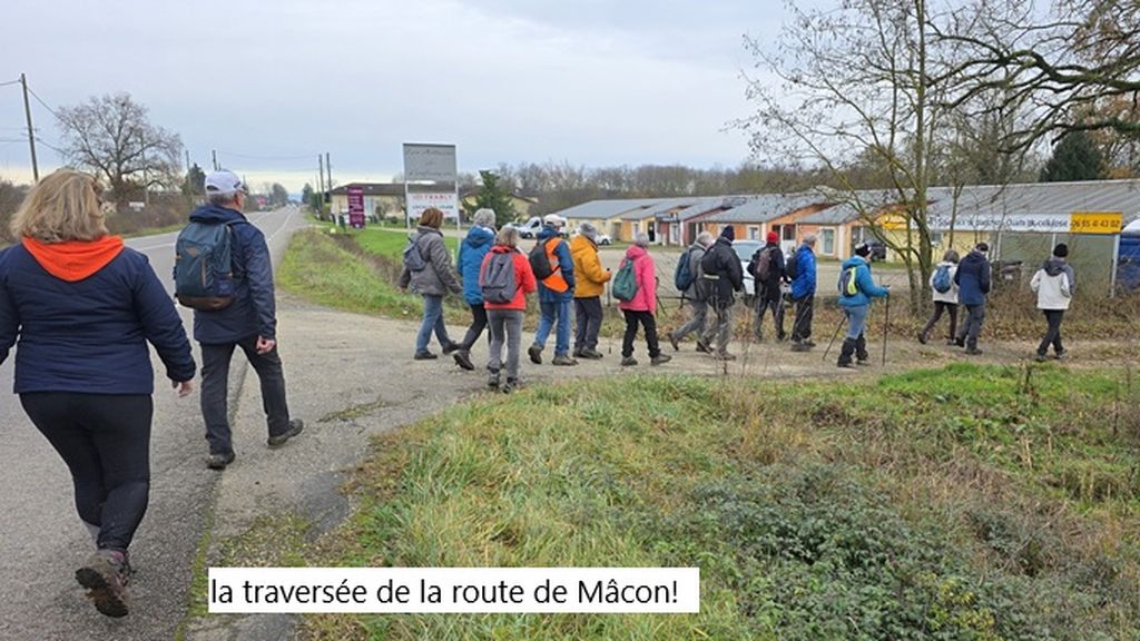 Un petit sentier humide recouvert de feuilles nous conduit à proximité de l’auberge de la Sarrazine qui semble déserte et mal entretenue . Nous nous regroupons pour traverser prudemment la RN 79 avec en face de nous la zone artisanale de Cornaton . Nous évoluons dans les prés gaugés ( bon exercice pour la souplesse des chevilles ) mais à chaque fois une trouée au milieu d’une haie nous permet de passer au pré suivant ( merci Gilbert pour la reco ) . Nous atteignons le hameau de Montfalcon et le goudron ce qui nous permet de racler nos godillots crottés et de faire un tour d’horizon pour nous réorienter .