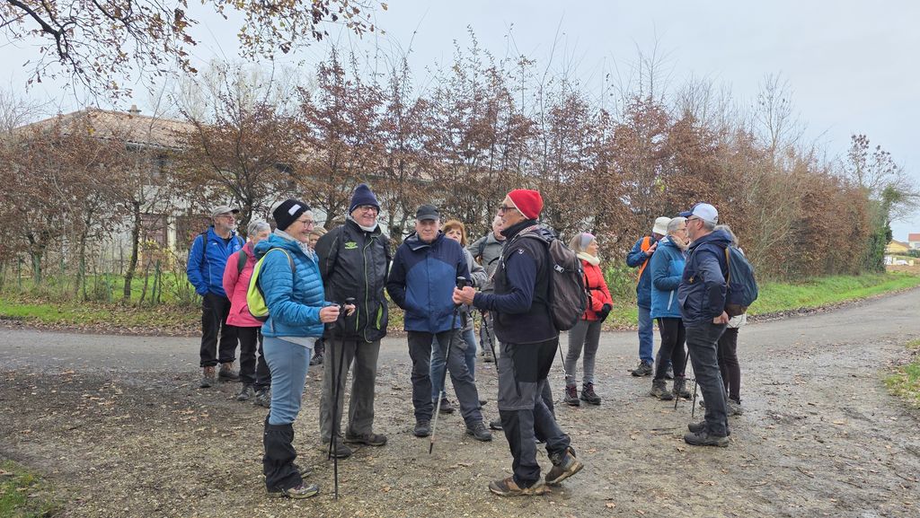 Après les pluies en continu de la veille et le brouillard matinal , 17 randonneurs ont décidé de sortir de leur tanière pour se regrouper à l’aire de covoiturage du Logis Neuf . La pluie est annoncée vers 16h, alors vite profitons de cette embellie . Nous longeons la route de Mâcon sur des trottoirs bien aménagés et nous nous engageons dans les lotissements en suivant la petite route en sens unique qui descend dans une combe et qui remonte en direction du centre du village de Confrançon ( 1500 hab ) .