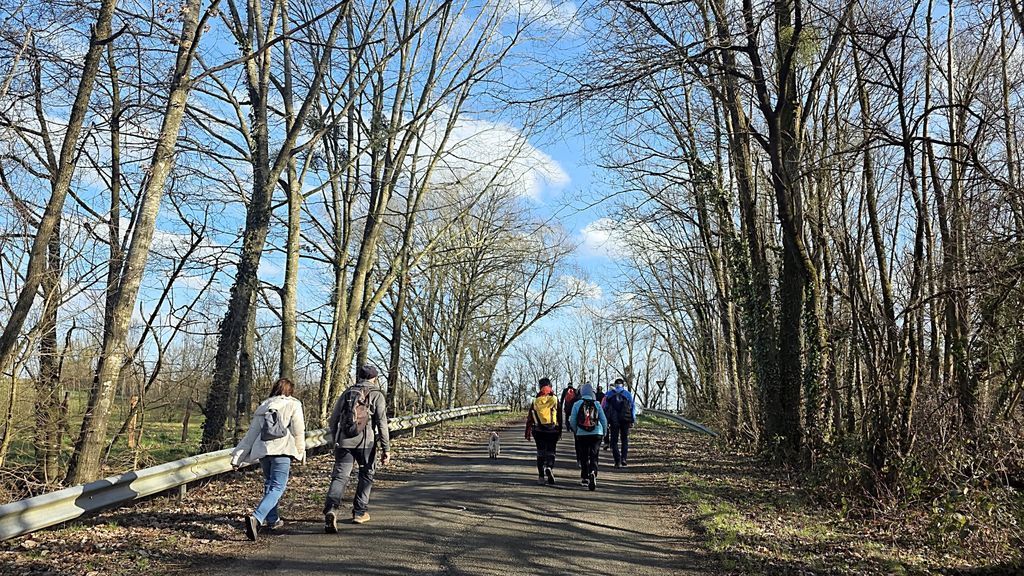 Nous longeons l’autoroute très bruyante en direction de Dompierre ( hameau de Polliat ) et c’est avec plaisir que nous empruntons un chemin campagnard en lisière de bois où des bûcherons sont en pleine action . La terre argileuse colle à nos semelles et ralentit notre vitesse de croisière . Nous sommes à proximité d’Attignat et traversons des hameaux regroupés sur des hauteurs et perdus dans le bocage bressan ; nous suscitons la curiosité des chevaux , des ânes , des oies qui viennent nous saluer derrière leurs barrières .