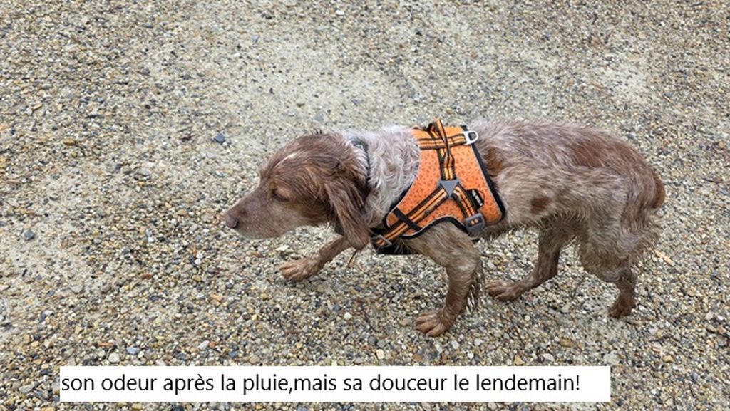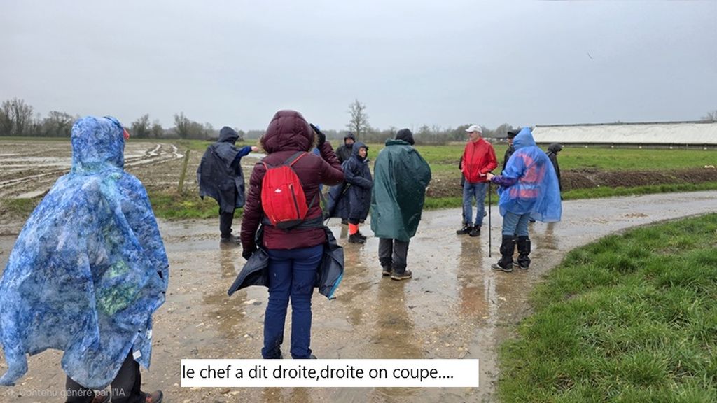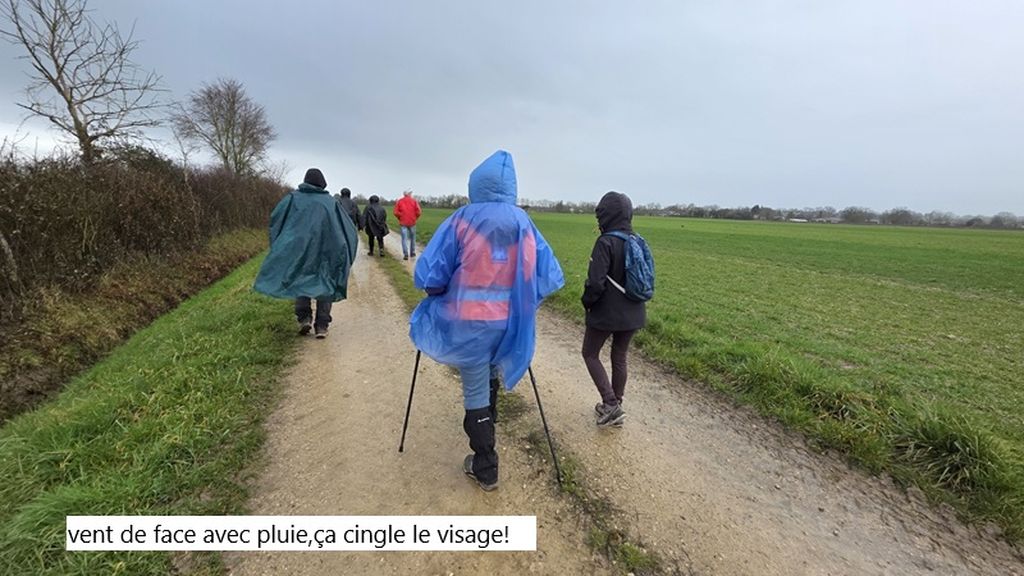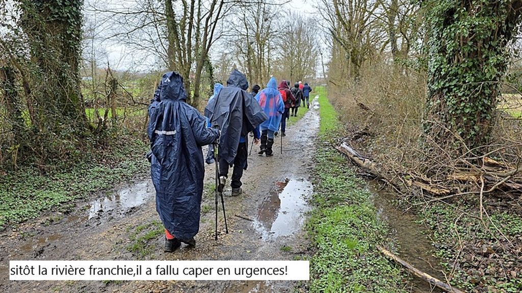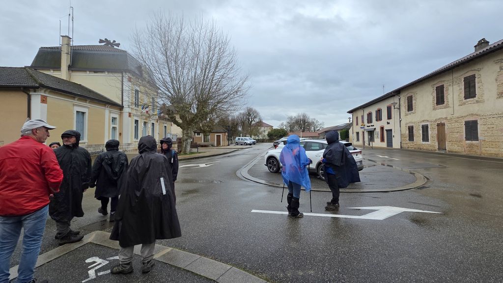 On sollicite Brigitte pour qu’elle sorte son poncho afin de conjurer le mauvais sort!Rien n’y fait,les grosses gouttes résonnent sur nos capuches.On était prévenu,une pause s’impose,il faut bâcher.Avec les doigts engourdis,passer la tête par le trou de la pélerine demande de l’entraide.Avec ce défilé de bonshommes affublés de la sorte ,Pagneul panique.Mais il est où mon patron?Rassuré,un petit tour dans le village de Cras s’impose avec passage devant » l’Escale » salle des fêtes qui fait des envieux parmi les Montceliens!