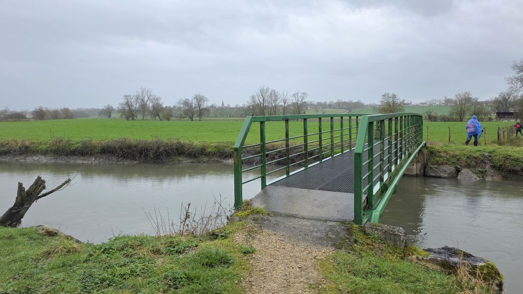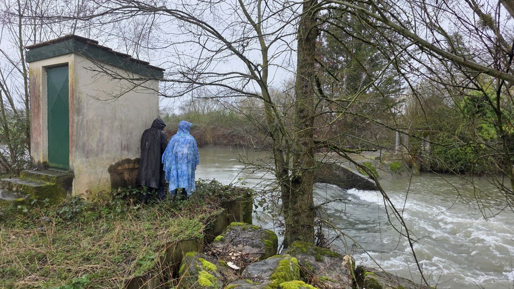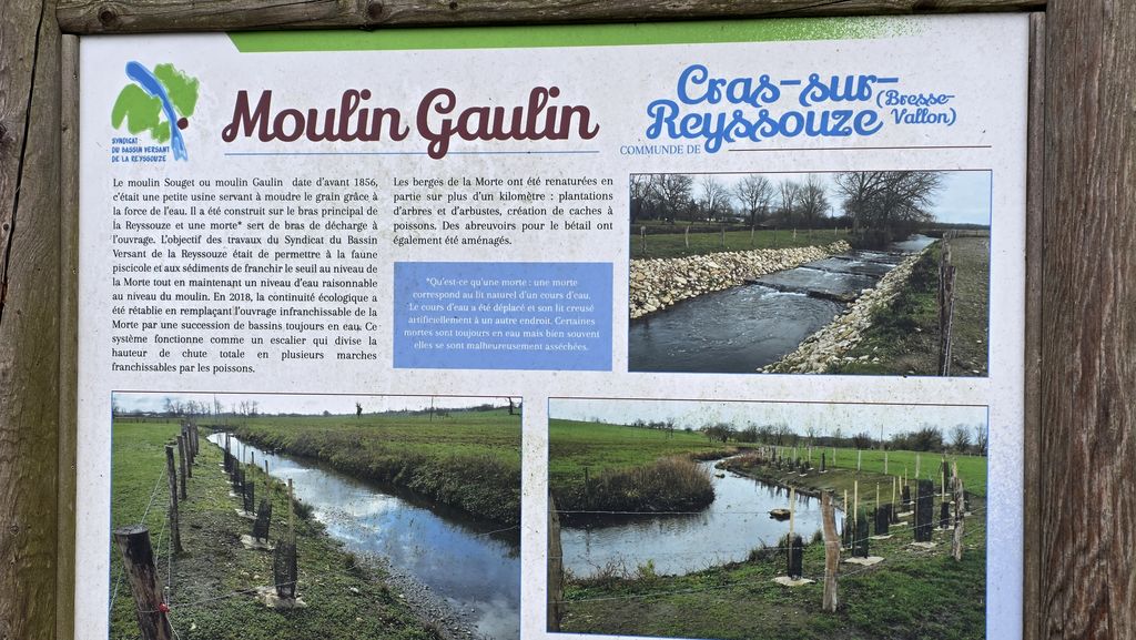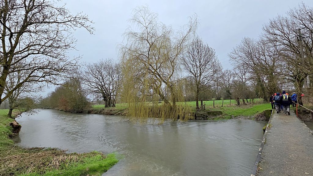 On en est où?Le GPS intégré au téléphone apprécie modérément les gouttes d’eau mais un vague souvenir me fait dire que si l’on fait droite-gauche le circuit est raccourci!Le clocher d’Attignat se rapproche et le passage vers l’ancien moulin Godin avec la Reyssouze toujours aussi tumultueuse nous indique la bonne direction.