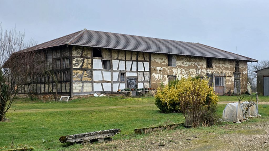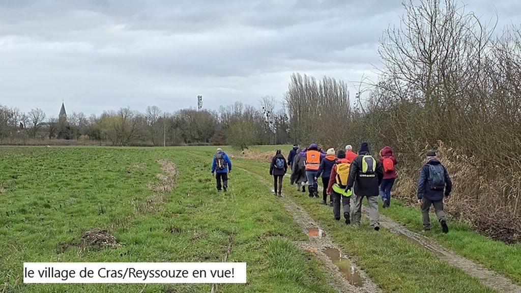 Nous partons du parking du château de Salvert à Attignat .Sur la petite route que nous empruntons pas de pluie mais la présence d’un arc en ciel avec un horizon bien dégagé.Les nuages bas sont déjà accrochés sur les premiers contreforts du Revermont bien proches.La pluie nous contourne.Ce qui est pris est pris!Nous slalomons au milieu des flaques d’eau dans un chemin empierré pour arriver à la Reyssouse qui charrie à gros flots ses eaux terreuses.A peine franchi la passerelle,une petite pluie fine s’invite,presque légère.