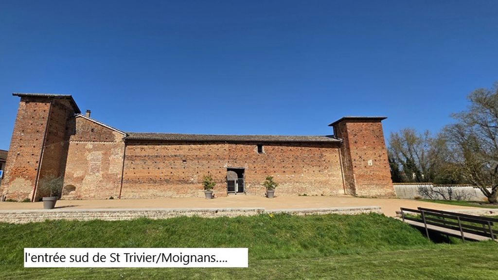 Tout le monde situe St Trivier sur Moignans mais depuis la création de la rocade qui contourne le village les automobilistes ignorent cette petite cité pourtant siège des ETS Bernard ( céréales ) et des cycles Mavic…. Le dernier bistrot a fermé et cela n’incite pas à s’arrêter .Au lieu de rdv sur la place intimiste de la mairie nous sommes 12 à vouloir découvrir la campagne environnante en longeant la RD 936.Un petit tour par le majestueux monument aux morts,où aucun Poncet ne figure,et c’est derrière des glissières de sécurité que l’on s’enfonce dans un paysage de grandes parcelles agricoles après avoir dépassé un hameau de « ferrailleurs ».