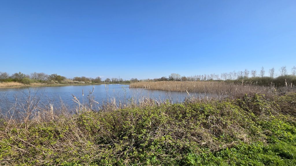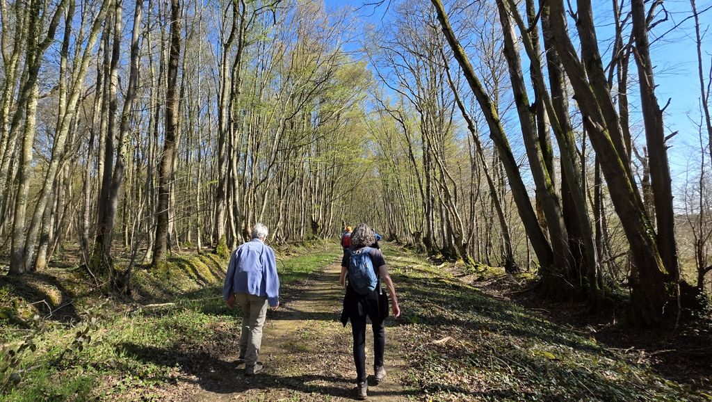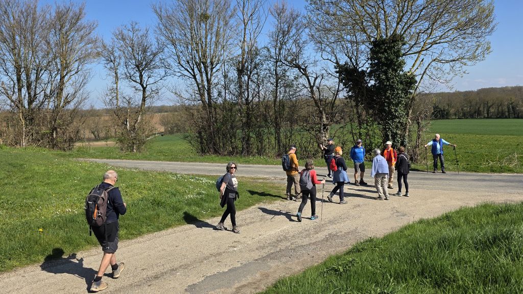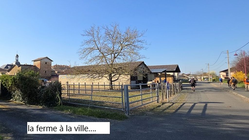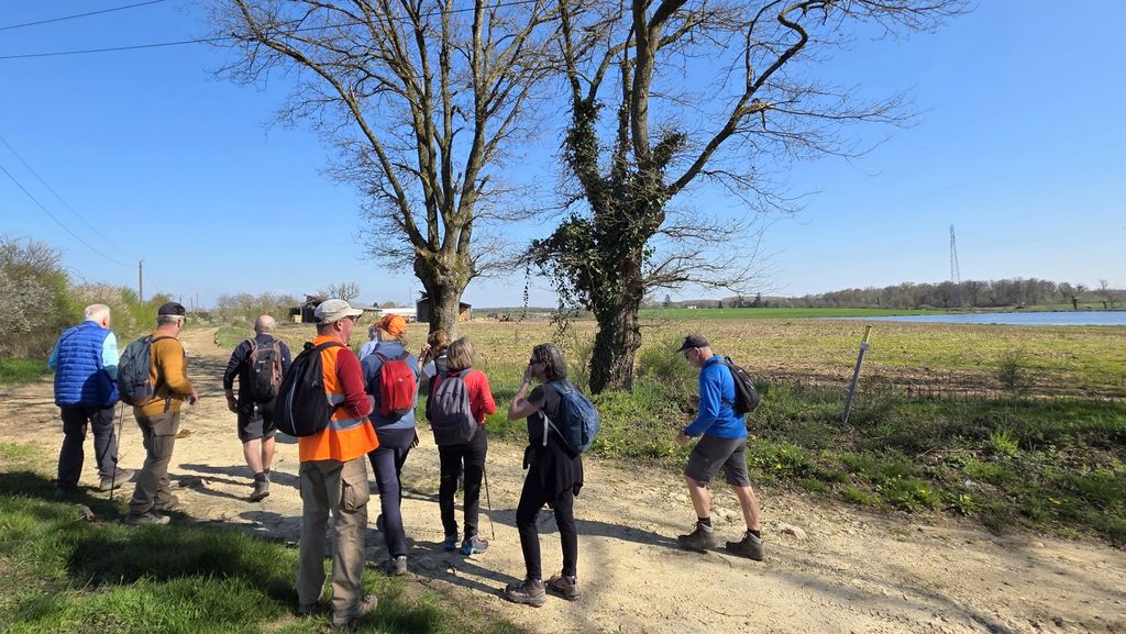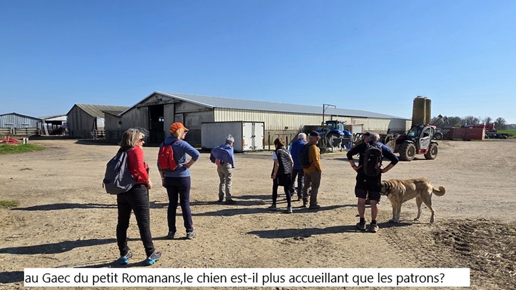 Un petit tour de l’édifice et un large chemin mi-empierré,mi- herbeux nous fait pénétrer dans un paysage typique des Dombes:de grands champs prêts à être labourés,des taillis pas encore feuillés qui nous permettent d’entre-apercevoir les monts du Beaujolais tout proches!Et même un étang en assec qui permet à Gilles,le spécialiste,d’expliquer à Chantal ( haut doubiste )le fonctionnement des étangs .Encore quelques pas avant d’atteindre à mi-parcours une route circulante,une méga ferme apparait à notre droite. Une multitude de bâtiments agricoles sont disséminés sur cette exploitation .Nous sommes au petit Romanans au GAEC de la grande Borne.Et la tentative de lier conversation avec un des employés reste succinte: »on élève des vaches pour la viande ».