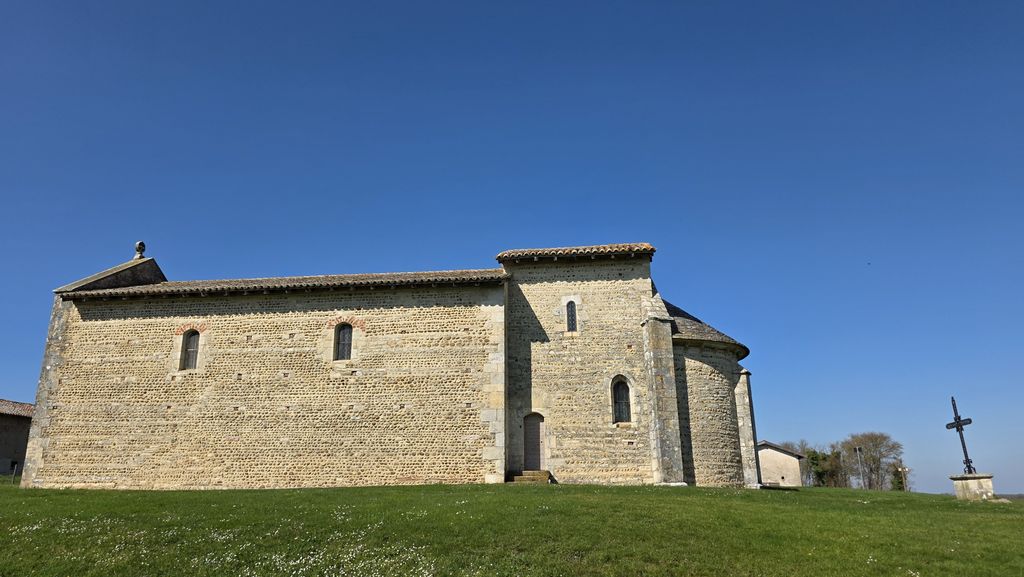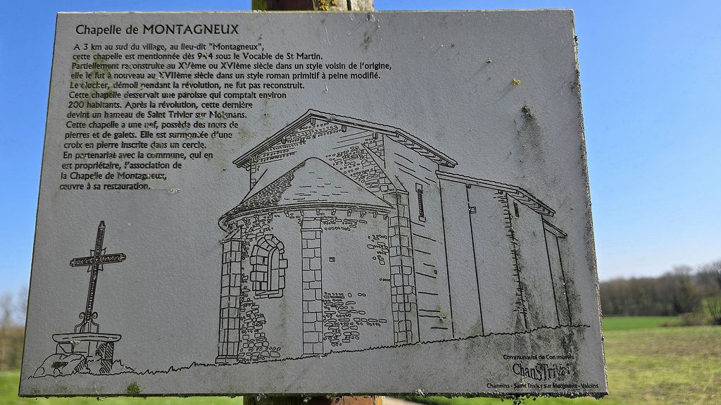Cela fait maintenant plusieurs années qu’à chaque sortie on voit des haras.Et bien la règle est respectée avec des grandes longueurs de lisse-paddock qui parquent des chevaux de course.Encore quelques hectomètres et nous arrivons au lieu-dit Montagneux.L’église de Montagneux est mentionnée dans les ouvrages dès 944 lorsqu’une dame Gisèle et son fils Hugues en font le don à l’abbaye de Cluny pour le repos de leur époux et père, Bermon, seigneur de Bouligneux.Des textes nous apprennent qu’en 1614, le sanctuaire et le clocher étaient ruinés, qu’il ne restait plus alors que la nef avec un seul autel. Le chœur et l’abside furent alors reconstruits peu après cette date dans le style roman primitif à peine modifié.Le clocher, démoli pendant la révolution, ne fut pas reconstruit. Une des trois cloches de l’église de Saint-Trivier provient de la chapelle de Montagneux.