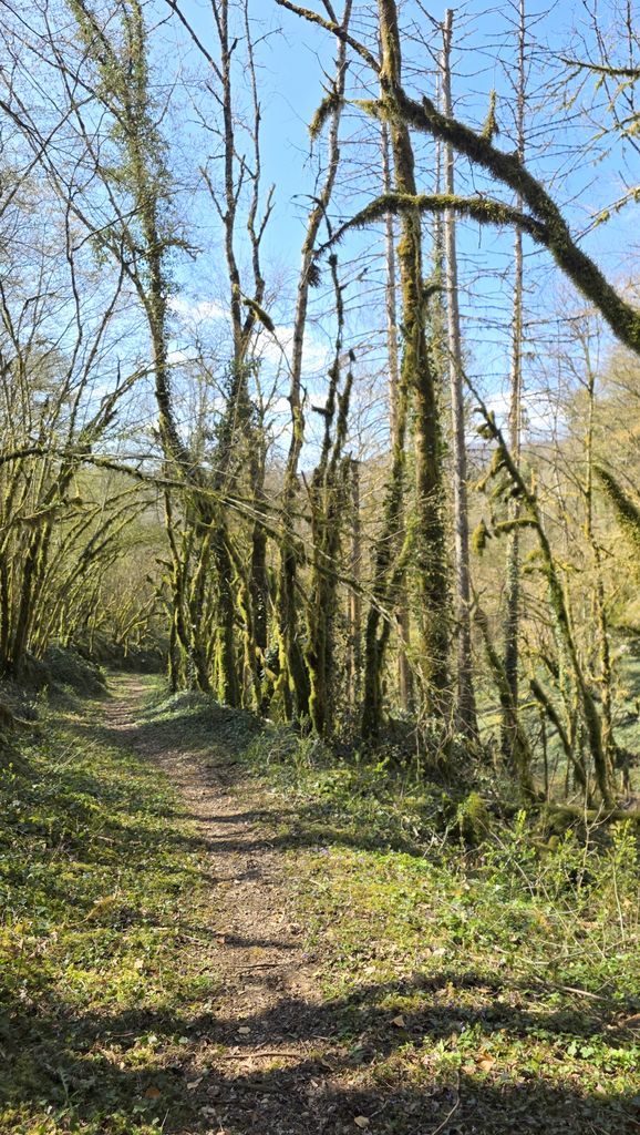 L’option de prendre un raccourci est -elle la bonne décision?La trace envisagée est bien là mais a l’air peu fréquenté par les chasseurs.On a connu pire et après tout il n’y a pas de ronces,l’ennemi n°1 du randonneur.Petit gymkhana parmi les arbres couchés,les troncs morts,les branches qui craquent sous nos pieds et le groupe arrive à un single plus ouvert.Ce moment de solitude nous a permis de constater de près que les buis reprennent vigueur.Et … aussi de sortir de notre zone de confort.Bizarre de disserter de ce sujet au milieu de nulle part!Sorti de ce passage délicat,nous retrouvons l’autoroute avec des panneaux explicatifs:la source secrète,la grotte,les pelouses sèches,belvédère sur la vallée du Suran.Au fond,à droite le Mt Nivigne,plus haut sommet du Revermont,les hameaux de Rosy et Ceillat en face,le moulin Convert en contre bas….
