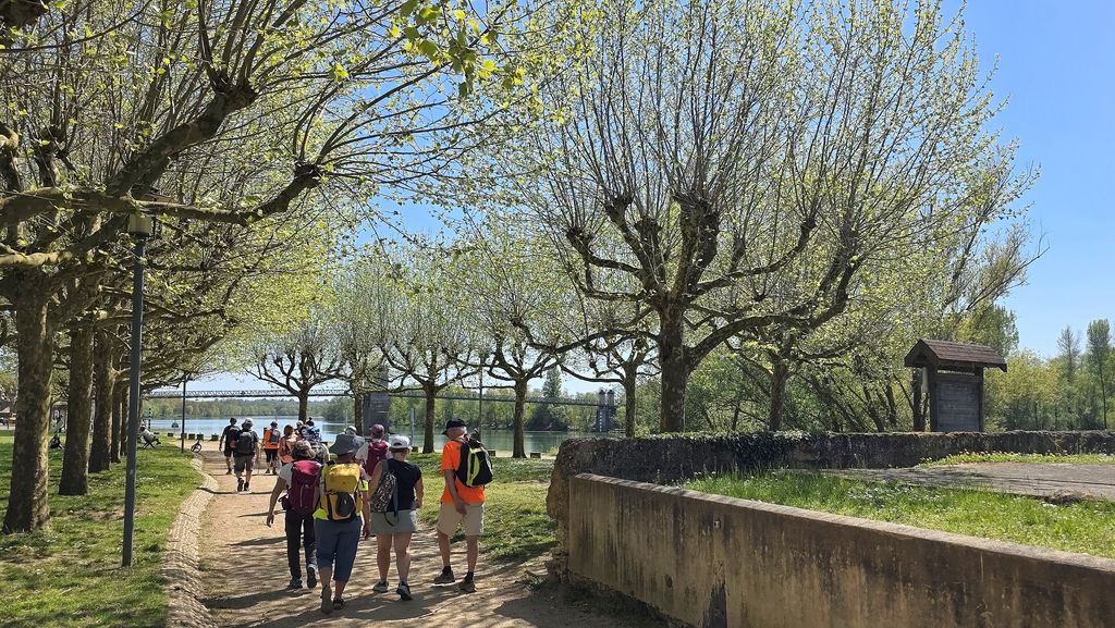 « Clac,clac,clac »ce bruit insolite revient à nos oreilles à chaque fois qu’une voiture passe sur le pont de Montmerle qui enjambe la Saône .Souvenirs , souvenirs , en 2019, nous étions au même endroit à quelques jours près pour faire cette sortie.Ce pont suspendu date de 1835 et avait un tablier en bois jusqu’en 1972, jour où un camion citerne est passé à travers!Depuis ce sont des travées en alliage d’aluminium qui ont été installées d’où cette sonorité atypique…