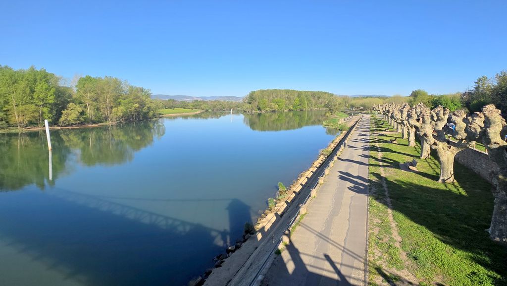 Nous sommes 17 à emprunter la voie bleue qui relie la Moselle à Lyon ,alors méfiance nos écarts pourraient être fatal aux cyclistes qui sont légion .Beaucoup de familles flânent sur le chenal ,quelques pêcheurs aussi profitent de la fraicheur matinale et d’une petite brise.Le camping *** encore désert est bordé de magnifiques platanes qui attirent notre attention:des marques peintes en bleu marquent la montée des eaux lors de certaines crues.Impressionnant et pourtant celle de 2001 n’est pas si lointaine que ça! D’énormes pieux sont dressés pour accueillir des péniches en difficulté mais cela ne risque pas d’arriver aujourd’hui,le courant est imperceptible ,même que c’est à se demander que quel côté l’eau coule!